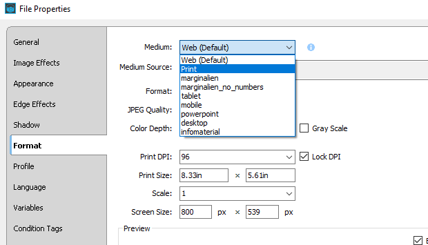 Für die HTML5-Ausgabe wird meist eine geringere Auflösung verwendet, für den Druck meist eine höhere. Bei Bedarf kann für die PDF-Ausgabe im Register PDF-Options die Auflösung geändert werden.