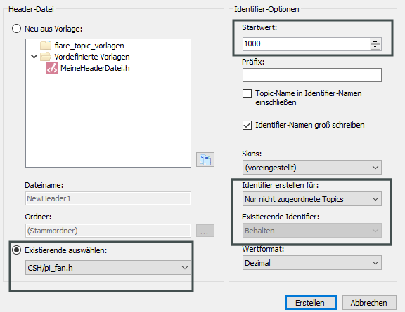 Im Dialog Identifier erstellen die bestehende Header-Datei wählen und bei Bedarf Startwert festlegen.