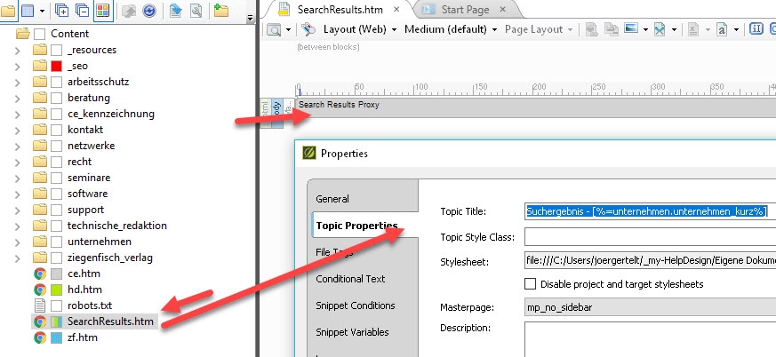 Die Seite mit den Suchergebnissen wird von MadCap bereitgestellt. Ein Überschreiben des Tab-Textes funktioniert nicht so einfach, wie dies an anderen Stellen der Fall ist. Umgehen können Sie das folgendermaßen: