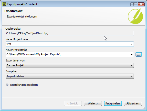Neuer Projektpfad: Verzeichnis wählen, in das exportiert werden soll.