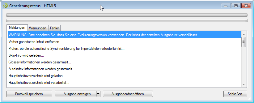 Warnungen: Listet Compiler-Warnungen auf, die nicht das Erzeugen der jeweilige Ausgabe verhindern, z.B. das Fehlen von Bildern.