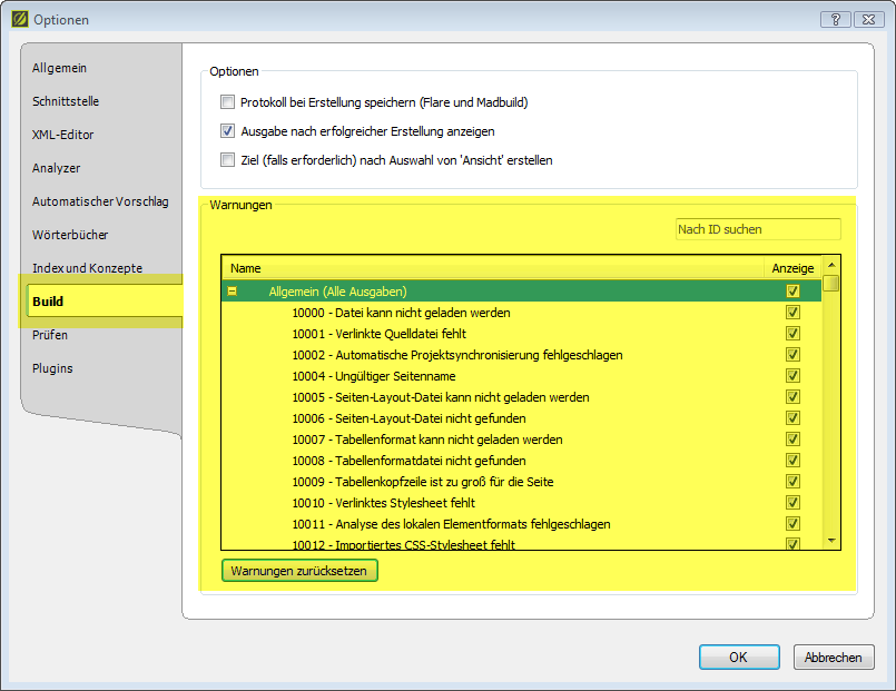 Warnungen zurücksetzen auf den Ausgangszustand: Klick auf Warnungen zurücksetzen.