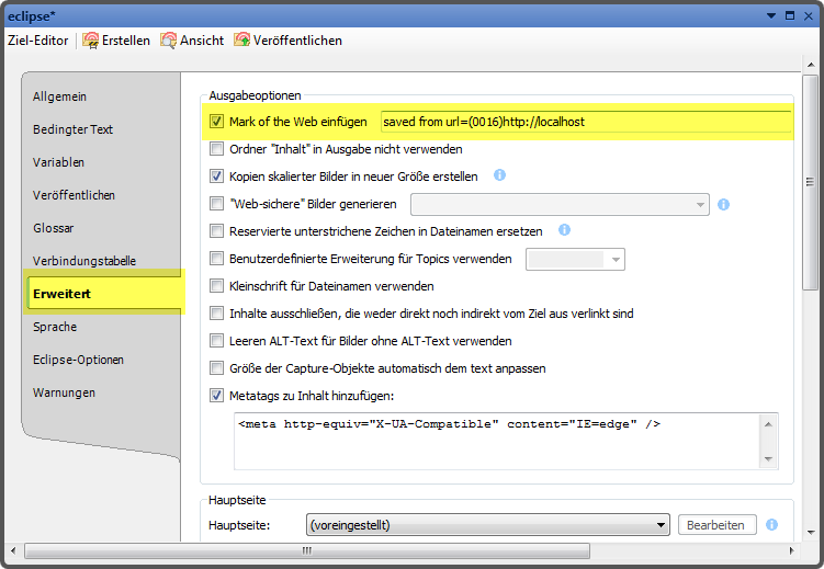 Für Online-Ausgaben wie HTML5, Eclipse Help, WebHelp usw. können nun in den entsprechenden Zielen MOTW-Kommentare (Mark of the Web) hinterlegt werden.