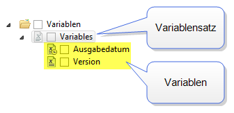 Dazu mussten die Variablen "greifbar" gemacht werden. Dies gelang, indem die in einem Variablensatz abgelegten Variablen unterhalb des jeweiligen Variablensatzes eingehängt wurden (siehe Abbildung).
