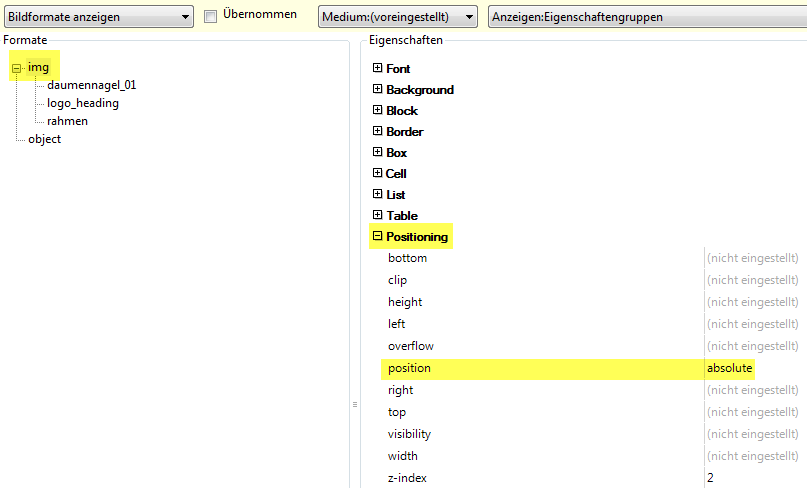 Das absolute Positionieren von beliebigen Elementen, z. B. Bildern, ist mit Hilfe von CSS zwar möglich, allerdings etwas mühsam und zeitaufwendig. Außerdem können Bilder z. B. in Topics nicht mit drag & drop verschoben und positioniert werden. Die entsprechenden CSS-Einstellungen für das img-Element: Zum Vergrößern / Verkleinern auf das Bild klicken |