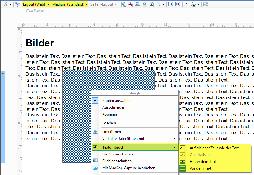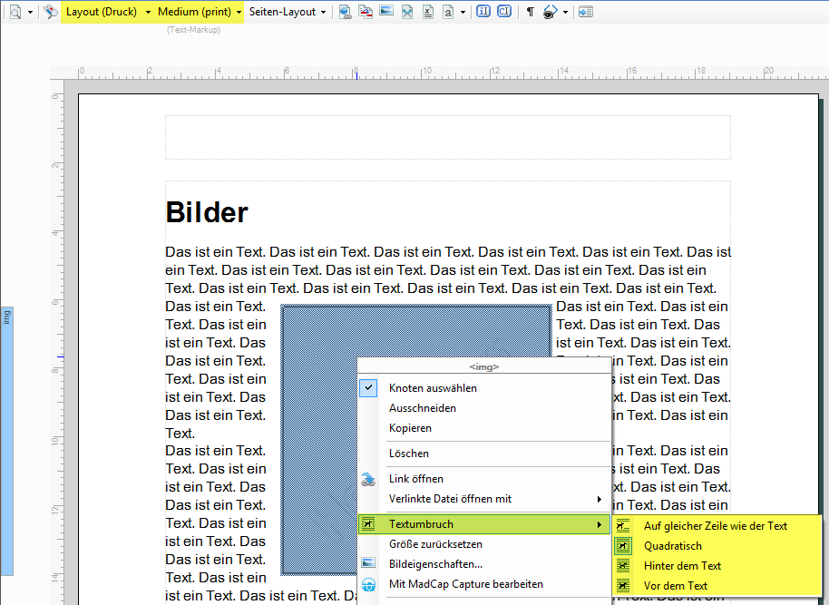 Nach dem Einfügen eines Bildes z. B. in ein Topic ist im Kontextmenü für Bilder ein neuer Eintrag verfügbar: Textumbruch. Rechtsklick auf Bild > Textumbruch > eine der Optionen wählen Ansicht Layout(Web): Zum Vergrößern / Verkleinern auf das Bild klicken Ansicht Layout(Druck): Zum Vergrößern / Verkleinern auf das Bild klicken Nach dem Zuweisen eines Textumbruchs lässt sich das Bild mit drag & drop beliebig im Editor verschieben und positionieren. Textumbruch ist für PDF und XPS sowie für alle Bildschirmausgaben verfügbar. Der quadratische Textumbruch ist nur für PDF und XPS und nur in der Ansicht Layout(Druck) verfügbar. Absolut positionierte Elemente verbleiben statisch an der Stelle, an der sie platziert wurden. |