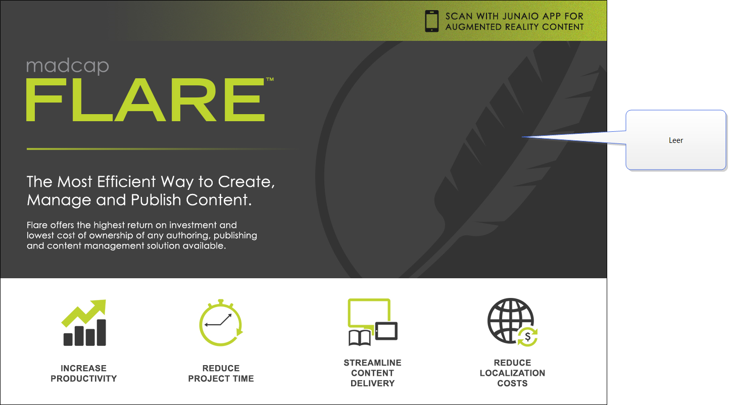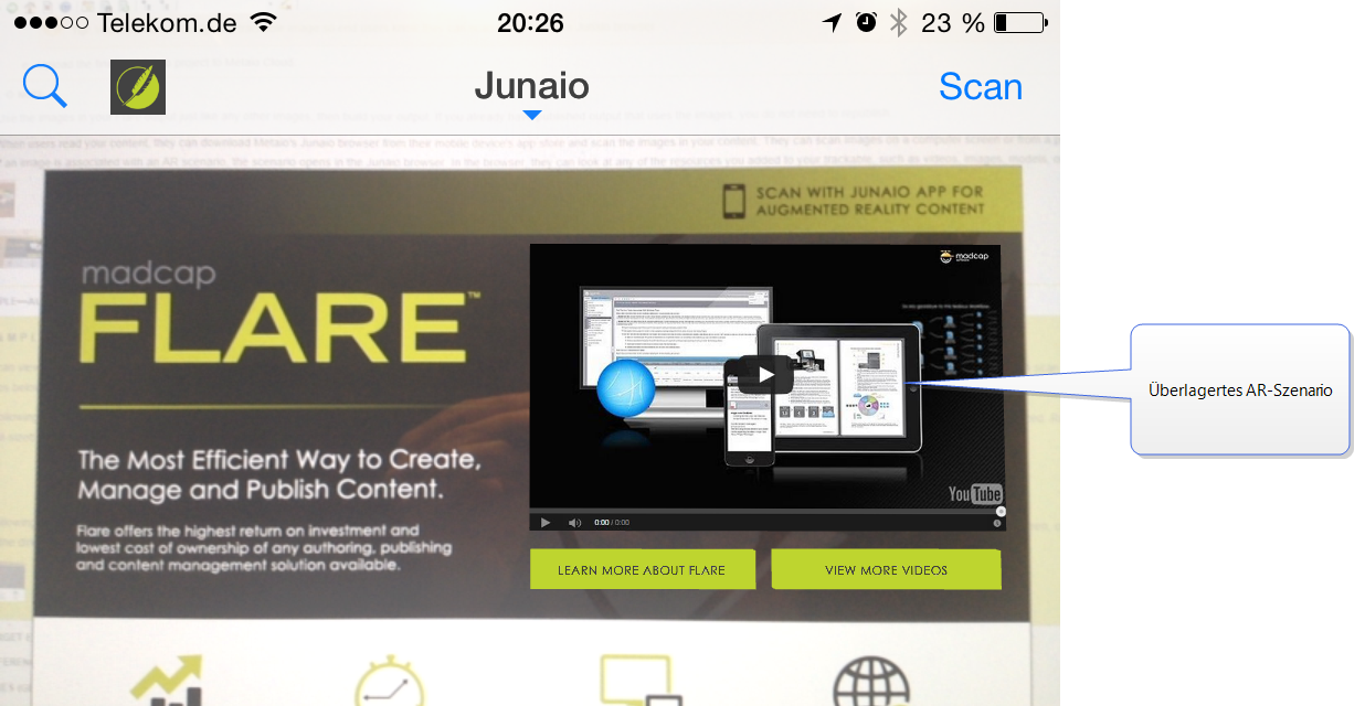 MadCap Flare unterstützt das Erstellen von Augumented Reality Szenarien. Grob gesagt geht es darum, die Realität, z. B. ein Bild von einem Objekt, mit zusätzlichen Informationen wie Text, Video, Bild usw. zu überlagern. Anwendungsbeispiel: Das Einblenden von Zusatzinformationen in das Bild einer Maschine, die mit der Kamera eines Tablets erfasst wird. Zur Umsetzung von Augmented Reality (AR) Szenarien in MadCap Flare-Projekten wird metajo Creator benötigt. Im Groben erfolgt die Umsetzung folgendermaßen:
