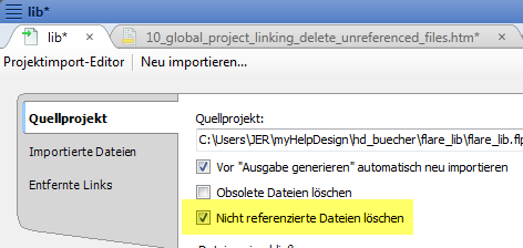 Nicht referenzierte Dateien in verlinkten MadCap Flare-Projekten können gelöscht werden: Project Organizer > Importe > Importdatei öffnen > Register Quellprojekte: Zum Vergrößern / Verkleinern auf das Bild klicken |