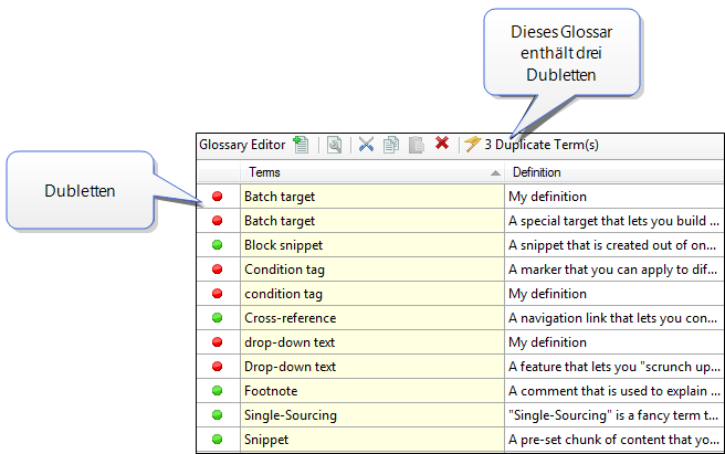 Dubletten werden mit einem roten Icon markiert.. Grüne Einträge sind einzigartig. Die Funktion macht keine Unterscheidung in der Schreibweise von Begriffen. “Bedingung” ist also gleichbedeutend mit “bedingung”. Zum Vergrößern / Verkleinern auf das Bild klicken |