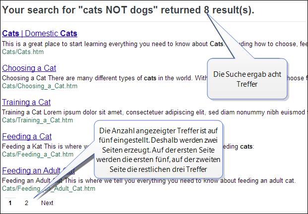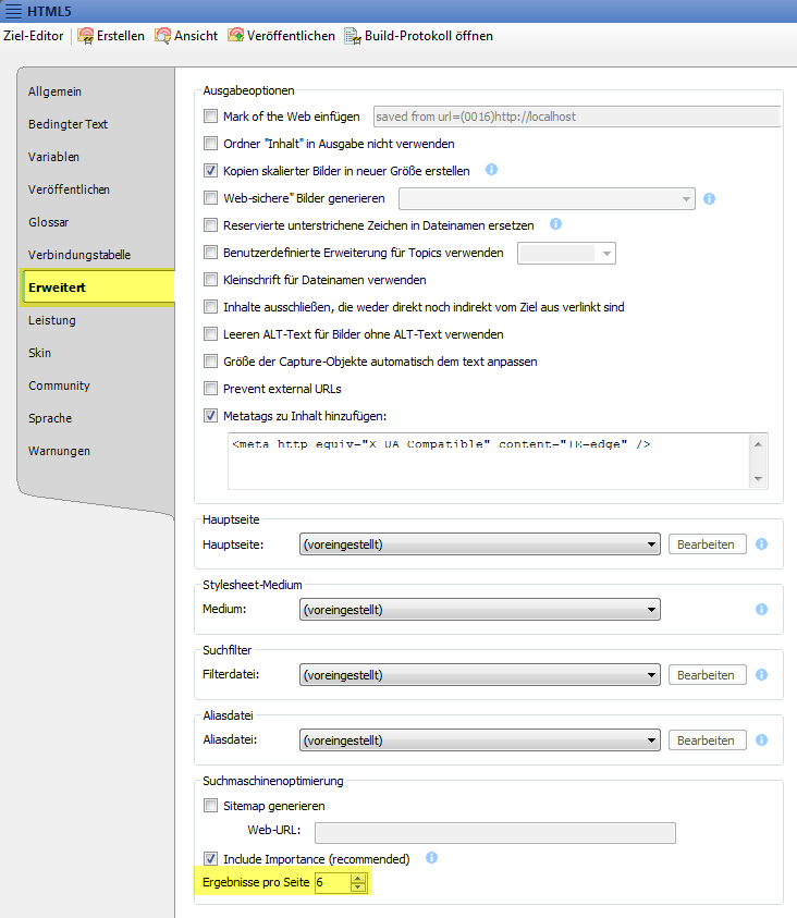 Bislang wurden alle Treffer in einer langen Liste angezeigt. Ab jetzt kann festgelegt werden, wie viele Treffer in der Trefferliste angezeigt werden solle. Sind mehr Treffer als darstellbar vorhanden, werden neue Seiten erzeugt. Die Seiten werden durchnummeriert. Zum Vergrößern / Verkleinern auf das Bild klicken Die Anzahl Treffer pro Seite wird im HTML5-Ziel festgelegt: Project Organizer > Ziele > HTML5-Ziel öffnen > Register Erweitert: Zum Vergrößern / Verkleinern auf das Bild klicken |