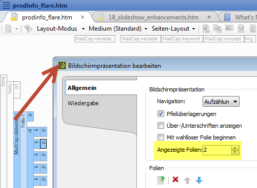 Pro Topic können so viele Folien einer Bildschirmpräsentation angezeigt werden, wie Folien vorhanden sind. Anzahl angezeigter Folien festlegen: Rechtsklick auf einer Bildschirmpräsentation (SlideShow) > Bildschirmpräsentation bearbeiten > Register Allgemein > Anzahl wählen. Zum Vergrößern / Verkleinern auf das Bild klicken |