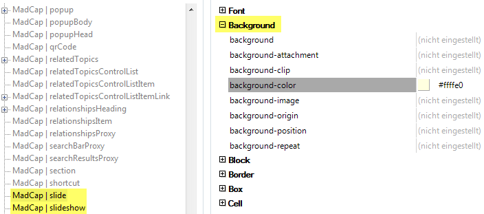Die Hintergrundfarbe von Bildschirmpräsentationen (SlideShow) kann abweichend von einer Hintergrundfarbe für Topics in der CSS festgelegt werden: Zum Vergrößern / Verkleinern auf das Bild klicken |