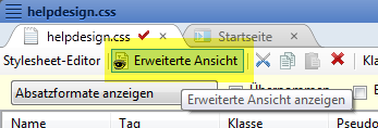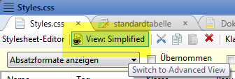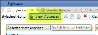 Im CSS-Editor (Content Explorer > Resources > Stylesheets > .CSS) wird angezeigt, auf welche Ansicht umgeschaltet werden kann.