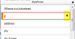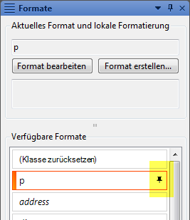 Oft benötigte Formatvorlagen können angeheftet werden. Das bedeutet, dass diese in einer Reihe von Formatvorlagen stets zu Beginn angeboten werden. Dadurch kann schneller auf Formatvorlagen zugegriffen werden. Angeheftete Formatvorlagen sind mit dem Symbol Formatvorlage anheften / lösen