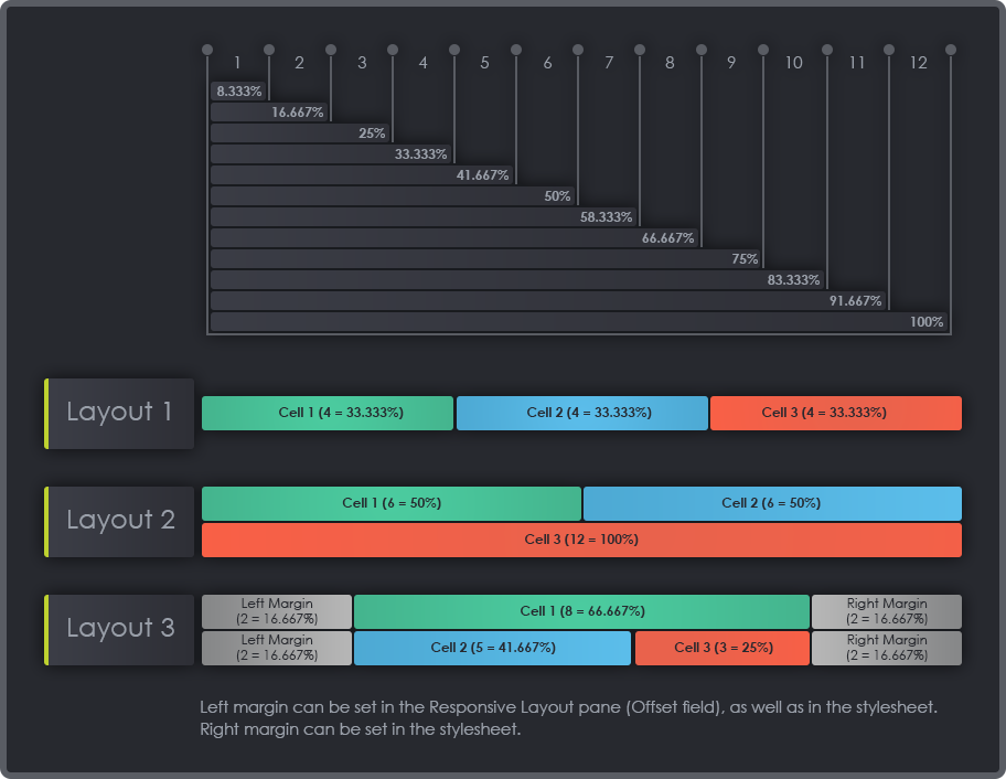 Sowohl das Foundation Framework als auch das neue MadCap Flare-System basieren auf eine 12-Spalten-Grid-System, d. h. eine Zeile kann 12 Spalten für den Inhalt nutzen. Beachten Sie, dass die Spalten Responsiv nur genutzt werden um die Breite des Inhalts zu steuern. MadCap Flare teilt automatisch die gesamte Breite des Bildschirms in 12 gleich breite Spalten auf. Für die Breite einer einzelnen Zelle geben Sie die gewünschte Anzahl an Spalten im Feld Cell Width im unteren Bereich wird der entsprechende Prozentwert angezeigt. Wenn Sie beispielsweise für die Zelle eine Breite von 6 Spalten hinterlegen, entspricht das 50 %.