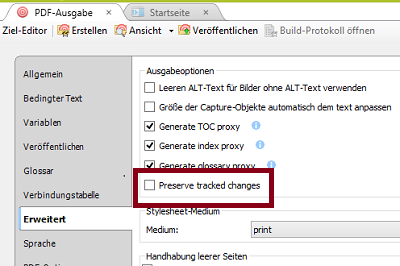 Im Ziel-Editor die Ausgabe der Änderungen und Kommentare aktivieren: Projektorganisation > Ziele > PDF-Ziel öffnen