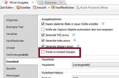 Register Erweitert > Bereich Ausgabeoptionen > Option Änderungen nachverfolgen erhalten aktivieren