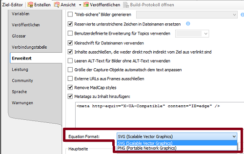 Flare konvertiert Formeln für die Ausgabe in das SVG- oder PNG-Dateiformat. Wählen Sie die bevorzugte Konvertierungseinstellung im Ziel-Editor > Register Erweitert