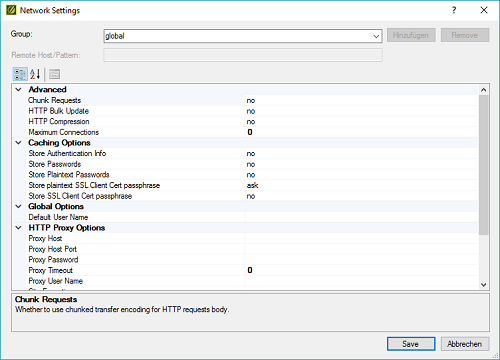 Wählen Sie die Gruppe, die Sie ändern möchten und ändern Sie die Einstellungen. Sie können die Einträge im Dialog Netzwerkeinstellungen nach Kategorien oder alphabetisch sortieren. Im Dialog haben Sie außerdem folgende Möglichkeiten: