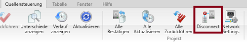 Verbindung zur Versionsverwaltung trennen: Menü Quellensteuerung > Bereich Projekt > Trennen