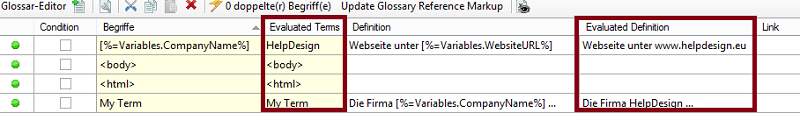 Anschließend werden im Editor zwei zusätzliche Spalten eingeblendet, die den Wert für die Variable anzeigen, der für die jeweilige Variable im Variablenset hinterlegt ist.