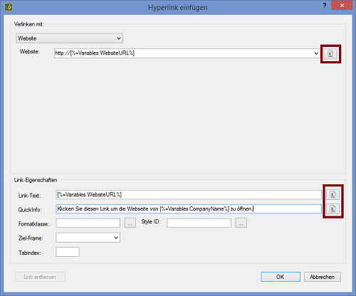 Sie können in zahlreichen Dialogen in MadCap Flare V12 die vorhanden Variablen nutzen. Achten Sie auf das Symbol