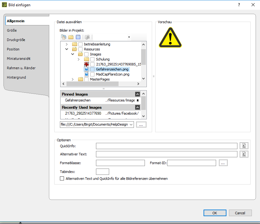 Sie können alle Bilder aus dem Bereich Kürzlich verwendete Bilder anheften. Bilder, die Sie noch nicht verwendet haben, wählen Sie in der Ordnerstruktur im oberen Bereich des Dialogs.