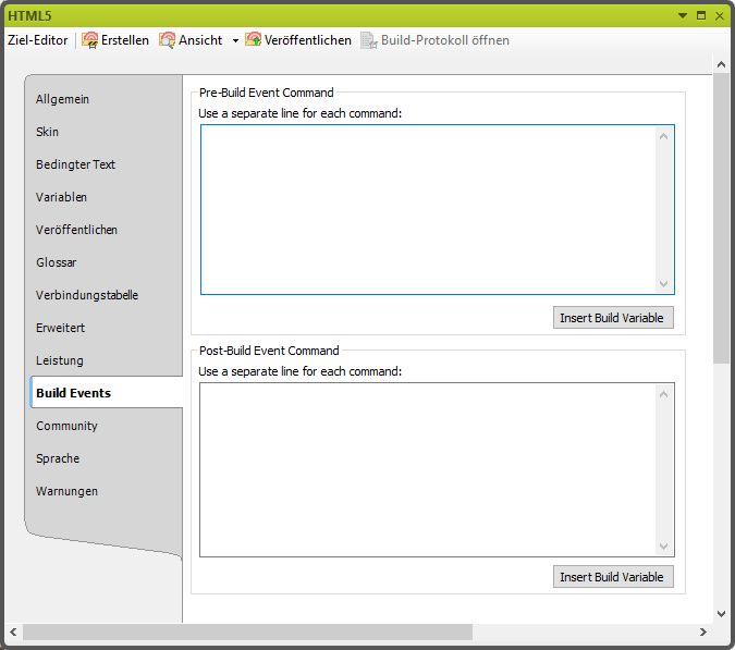 Im Ziel steht das neue Register Build-Events zur Verfügung. In diesem Register können Sie Aktionen hinterlegen, die vor oder nach der Erzeugung eines Ausgabeformats automatisch ausgeführt werden sollen.