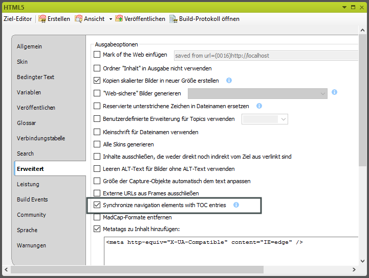 Das Setzen der Option ist nur bei Verwendung der Skin Top Navigation erforderlich. Wenn Sie die Skin Tripane verwenden müssen Sie keine zusätzliche Synchronisation der Inhaltsverzeichniseinträge wählen. Die Pfade für das Topic werden standardmäßig korrekt angezeigt.