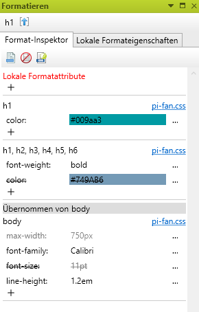 Im Formatierungsfenster wurde ein Format-Inspektor ergänzt. Im Format-Inspektor werden Details zu den jeweiligen Formaten angezeigt, abhängig von den Inhalten, die im XML-Editor markiert sind.