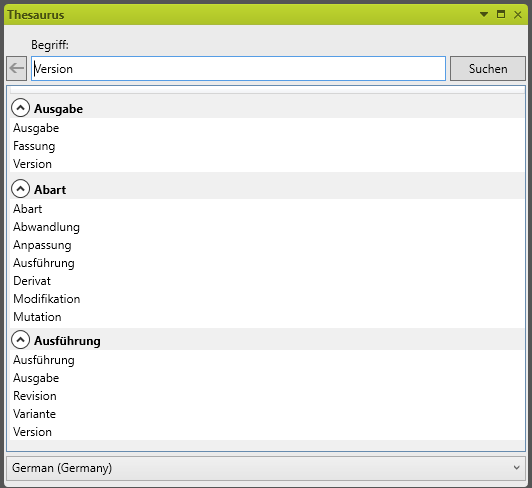 Im Fenster Thesaurus können Sie im Suchfeld den gewünschten Begriff manuell eingeben. Alternativ markieren Sie das gewünschte Wort im XML-Editor und drücken die Tasten Shift+F7