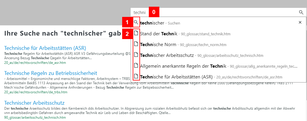 Beim Eingeben eines Suchbegriffs im Suchfeld (0) sucht die Elasticsearch in den Treffern vergangener Suchen (1) und in Inhalten (2) und zeigt entsprechende Treffer an.