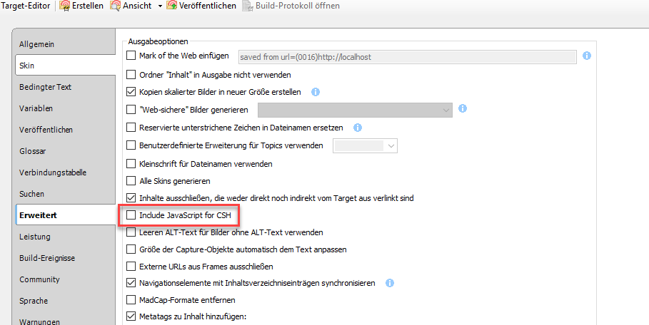 Target öffnen > Register Erweitert > Option Include JavaScript for CSH abwählen