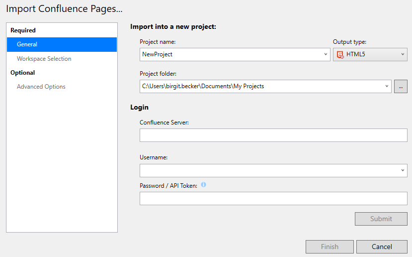 - Im Register General Projektnamen, Output-Typ und Ordner wählen. Alternativ können Sie Confluence-Dateien auch in ein bestehendes Projekt importieren.