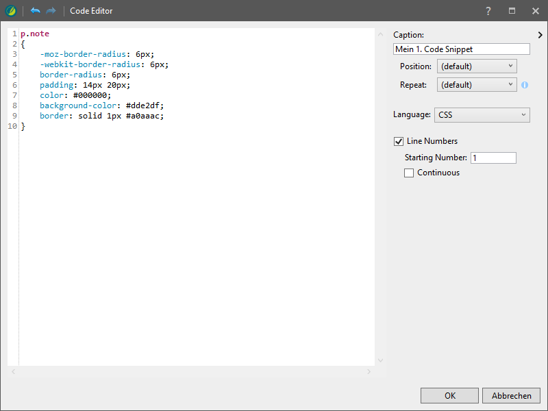 Im Dialog Code-Editor Quellcode einfügen und rechts die gewünschten Einstellungen wählen, z. B. Beschriftung, Sprache, Zeilennummern.