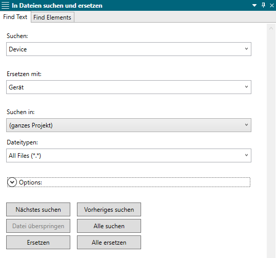 Die Funktion Suchen und Ersetzen wurde erheblich verbessert und in das Fenster Elemente Suchen integriert. Im Fenster Elemente Suchen sind nun zwei Registerkarten enthalten: Find Text und Find Elements.