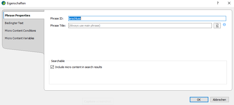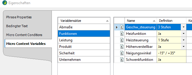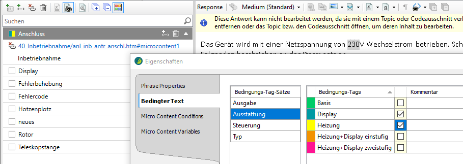 Die Micro Content-Funktion wurde erheblich verbessert. Sie können eine Kontextsensitive-Hilfe ergänzen, mit Bedingungen arbeiten und die Eigenschaften der Phrasen bearbeiten.
