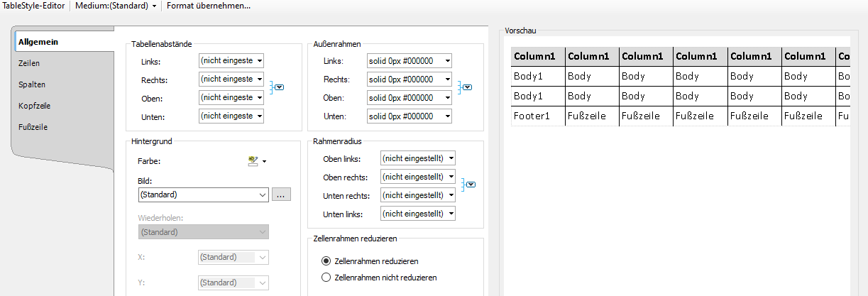 Der Editor für die Bearbeitung der Table Styles wurde überarbeitet. Die Vorschau wird nun auf der rechten Seite angezeigt, die Einstellungen nehmen Sie links vor.