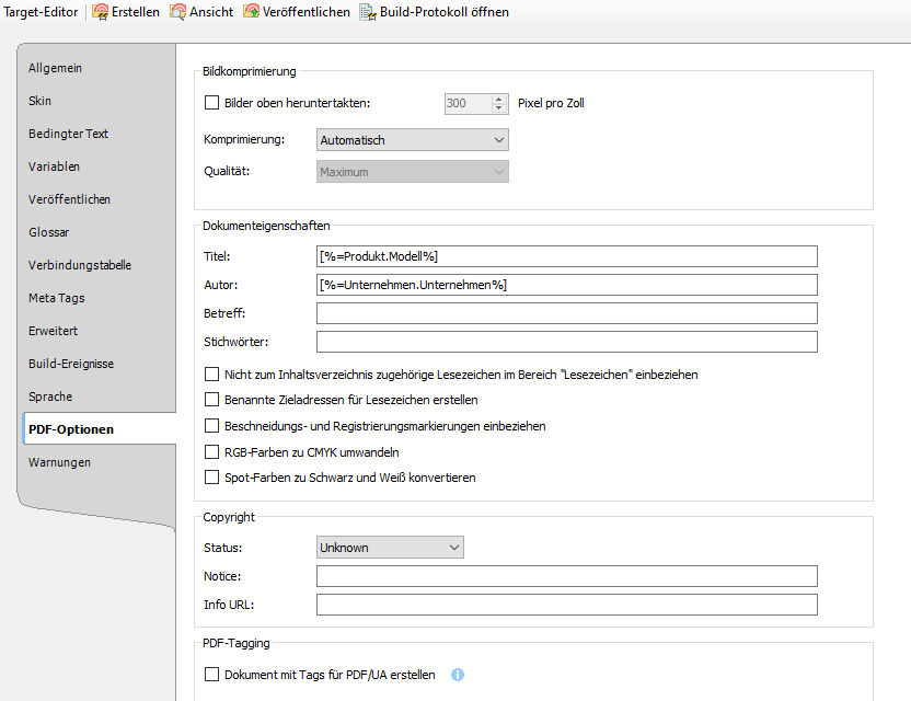 Im Abschnitt PDF-Optionen im Target Editor wurden neue Felder hinzugefügt. Mit diesen können Sie Ihrer PDF-Ausgabe Copyright-Informationen hinzufügen, die Informationen über den Status des Dokuments, einen Hinweistext und eine URL für Informationen bereitstellen.