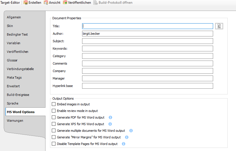 Im Target-Editor für Word wurde eine neue Registerkarte MS Word-Optionen hinzugefügt. Dieses Register enthält neue Felder, mit denen Sie angeben können, wie Dokumenteigenschaften in der Ausgabe gehandhabt werden.