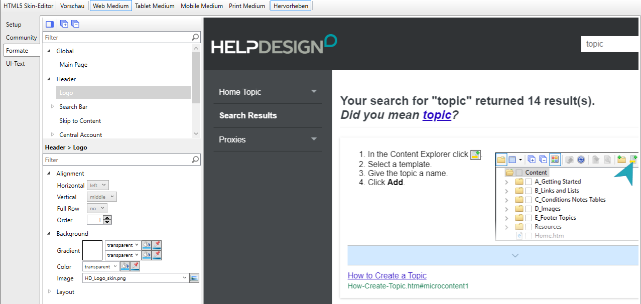 Sie können Ihrer HTML5-Ausgabe Micro Content hinzufügen, indem Sie ein reguläres vollständiges Skin wie Seitennavigation oder Top Navigation verwenden. Bei Bedarf können Sie zusätzliche Skin-Komponenten zum Einsatz bringen, die Sie im Target Editor einfügen können.