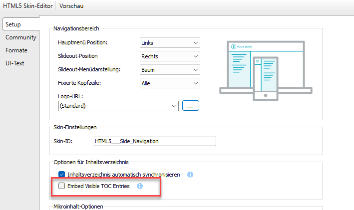 Eine neue Option im Skin-Editor für die rahmenlose Ausgabe (HTML5-Side- oder Top-Navigation) kann dazu beitragen "Flackereffekte" zu reduzieren, die Benutzer beim Klicken auf die Hauptnavigation des Inhaltsverzeichnisses (TOC) sehen können. Diese Option heißt "Sichtbare TOC-Einträge einbetten".
